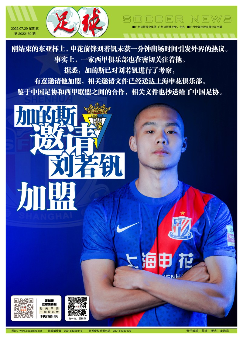 西甲加的斯邀刘若钒加盟,申花对球员留洋持开放态度
